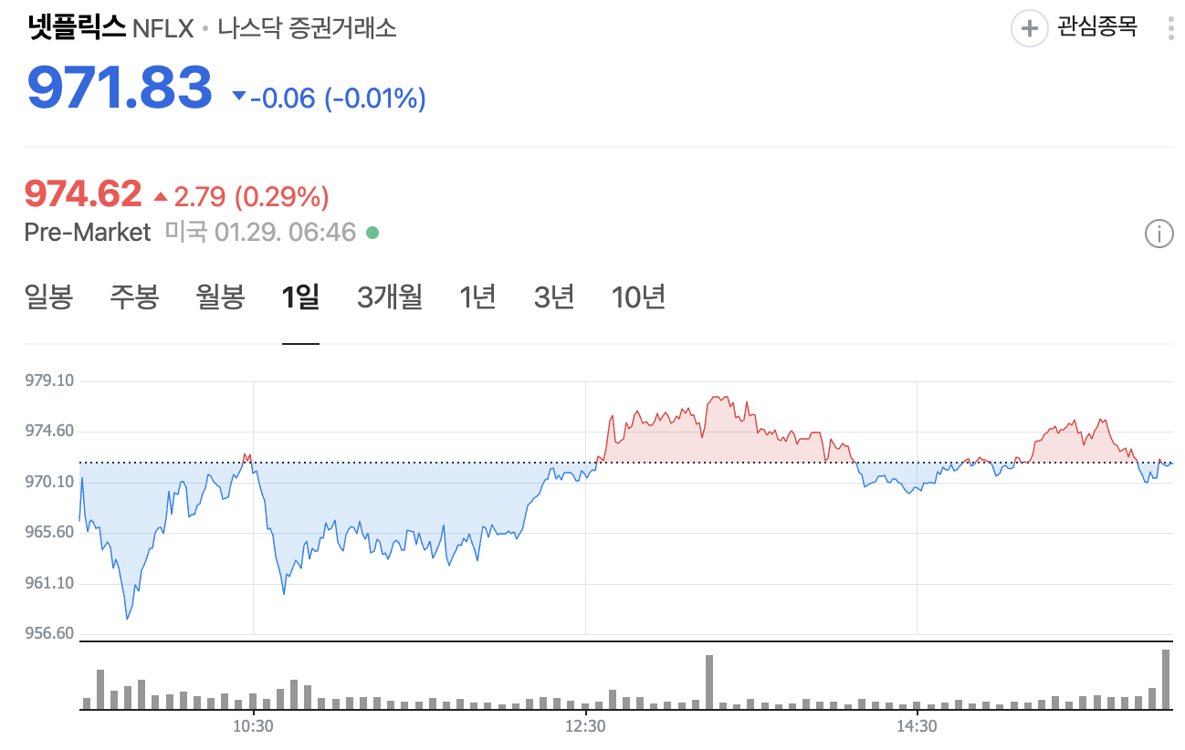 넷플릭스(NFLX) 주가가 급등하고 있습니다! 2025년 1월 29일 기준, 넷플릭스의 주가는 971.83달러에 거래되고 있습니다.