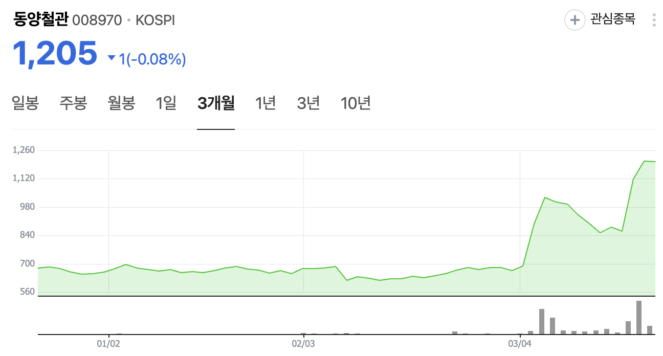 2025년 3월 20일 기준, 동양철관의 주가는 1,205원으로 전일 대비 0.08% 하락하였습니다. 이는 최근 거래 정지 후 상한가를 기록한 이후 지속적인 상승세를 보이는 모습입니다. 동양철관의 주가는 다양한 외부 요인과 기업의 실적 개선에 따라 변동성이 큰 모습을 보이고 있습니다.