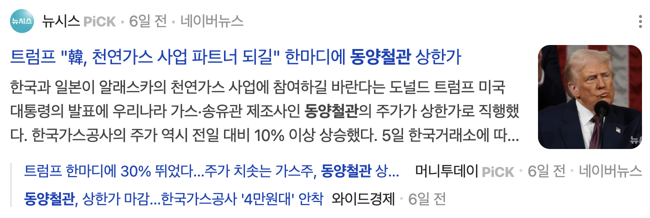 어제(3월 10일) “동양철관, 동해 심해 가스전 강관 공급 입찰 참여”라는 기사가 나왔어요. 정부의 가스전 개발 프로젝트와 해상풍력 하부구조물 수요 증가로 테마주로 떠오르며 주목받고 있습니다.