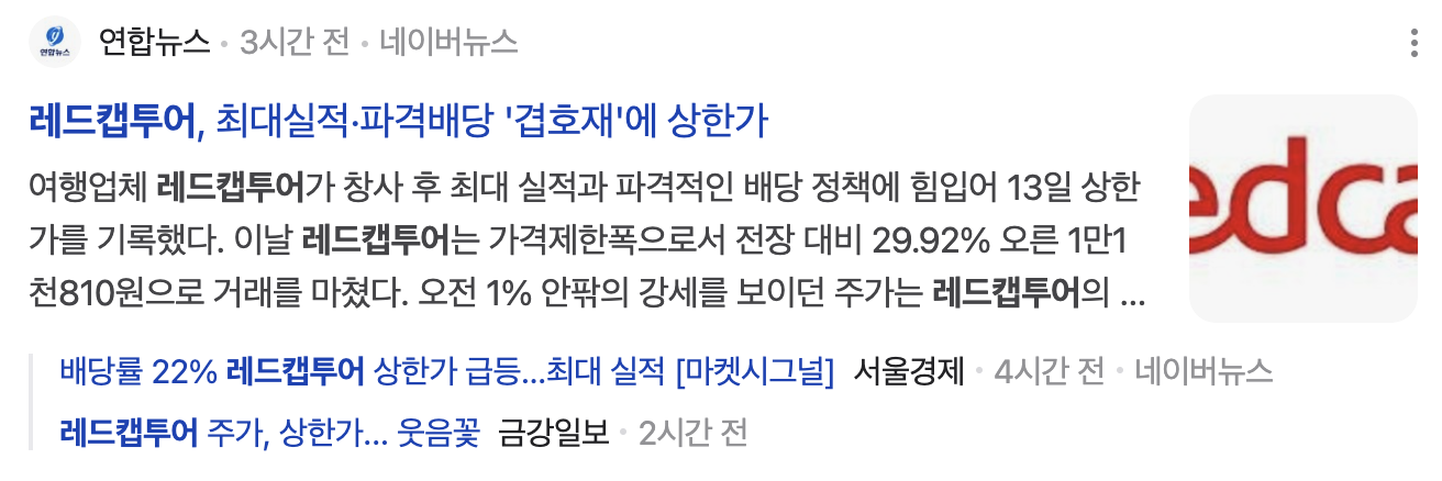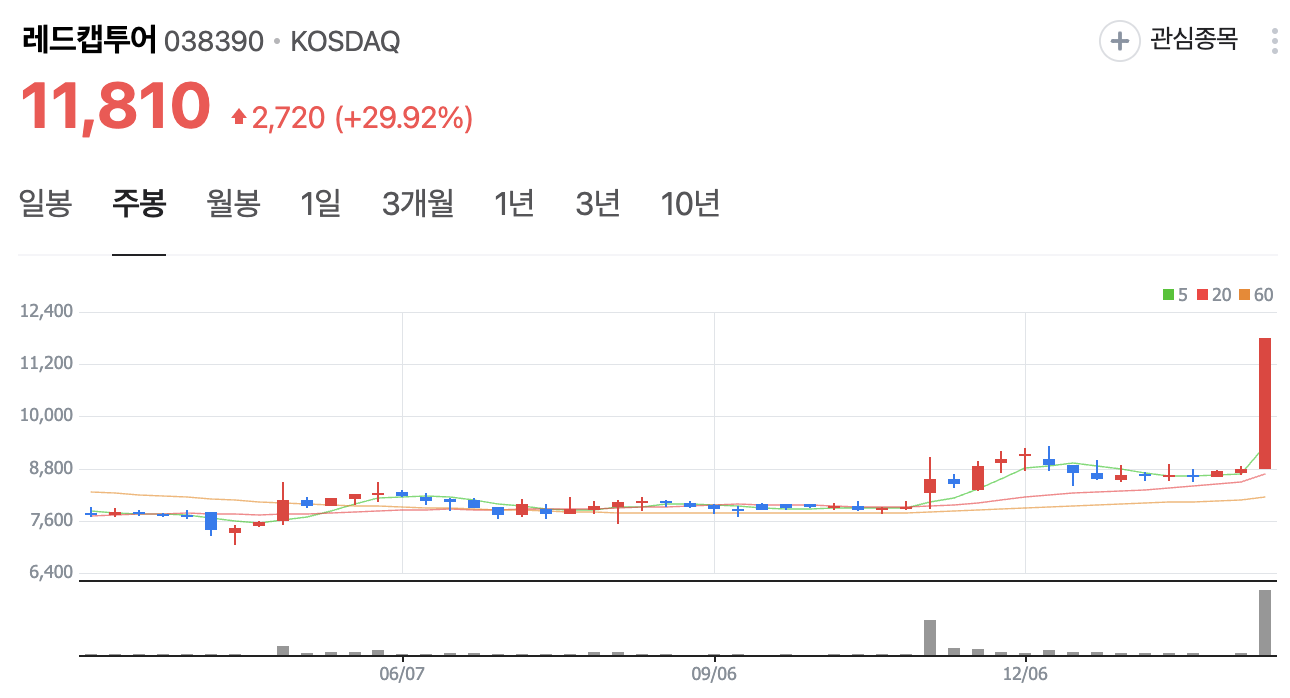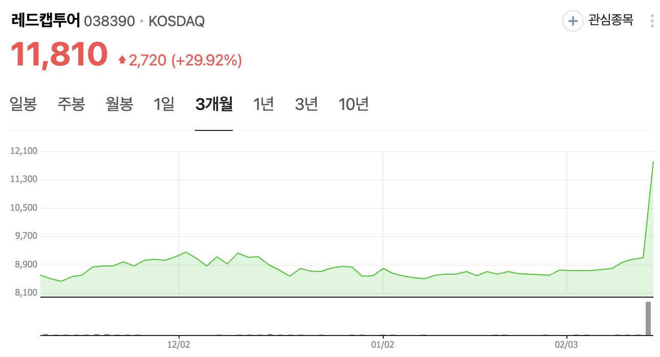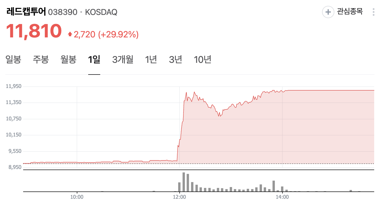 오늘 레드캡투어의 주가는 30% 급등하여 상한가를 기록했습니다. 이는 최대 실적과 배당 발표에 따른 투자자들의 관심 증가 때문으로 분석됩니다.