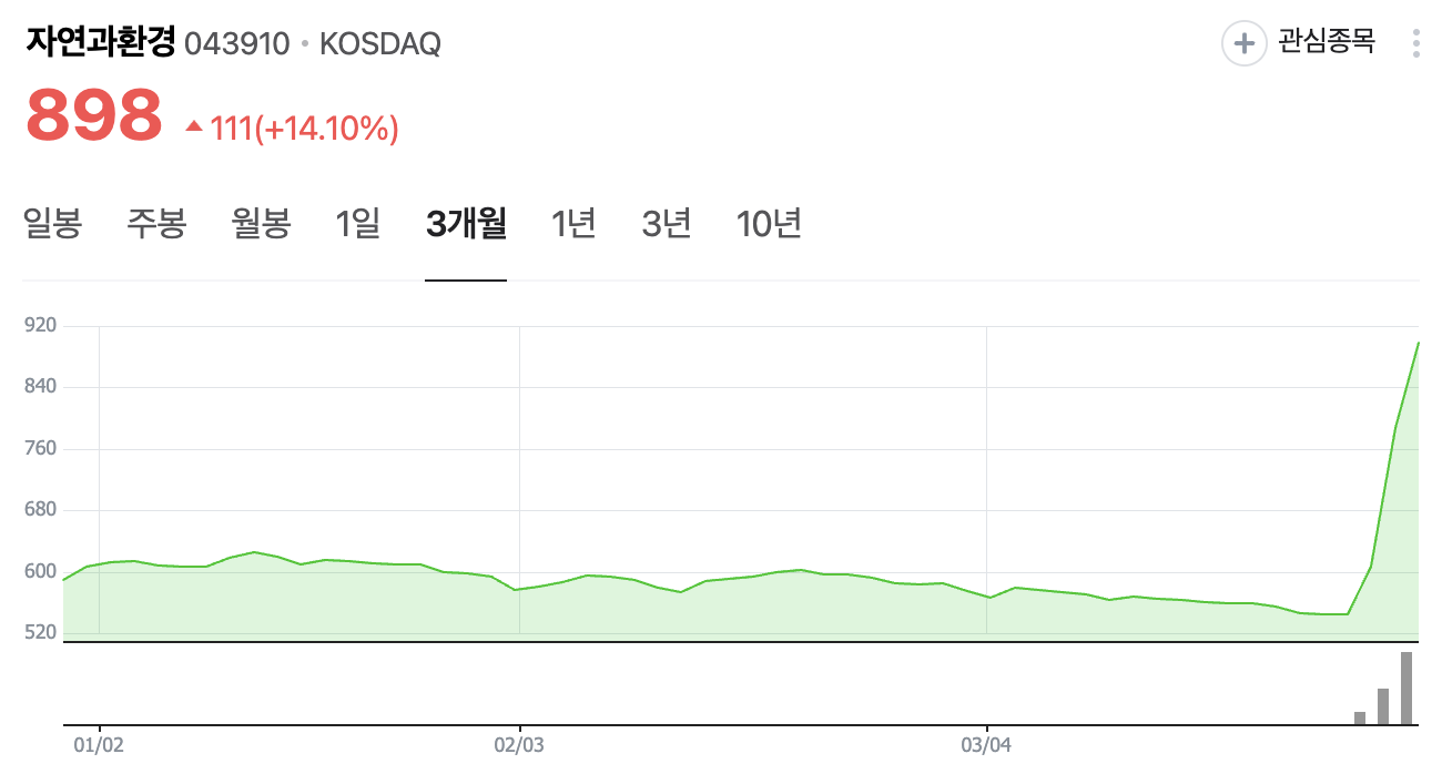 2025년 3월 28일 기준 자연과환경의 주가는 898원으로, 전일 대비 14.1% 상승하였습니다. 급등 원인은 산불 복구 테마와 친환경 정책에 대한 기대감입니다.