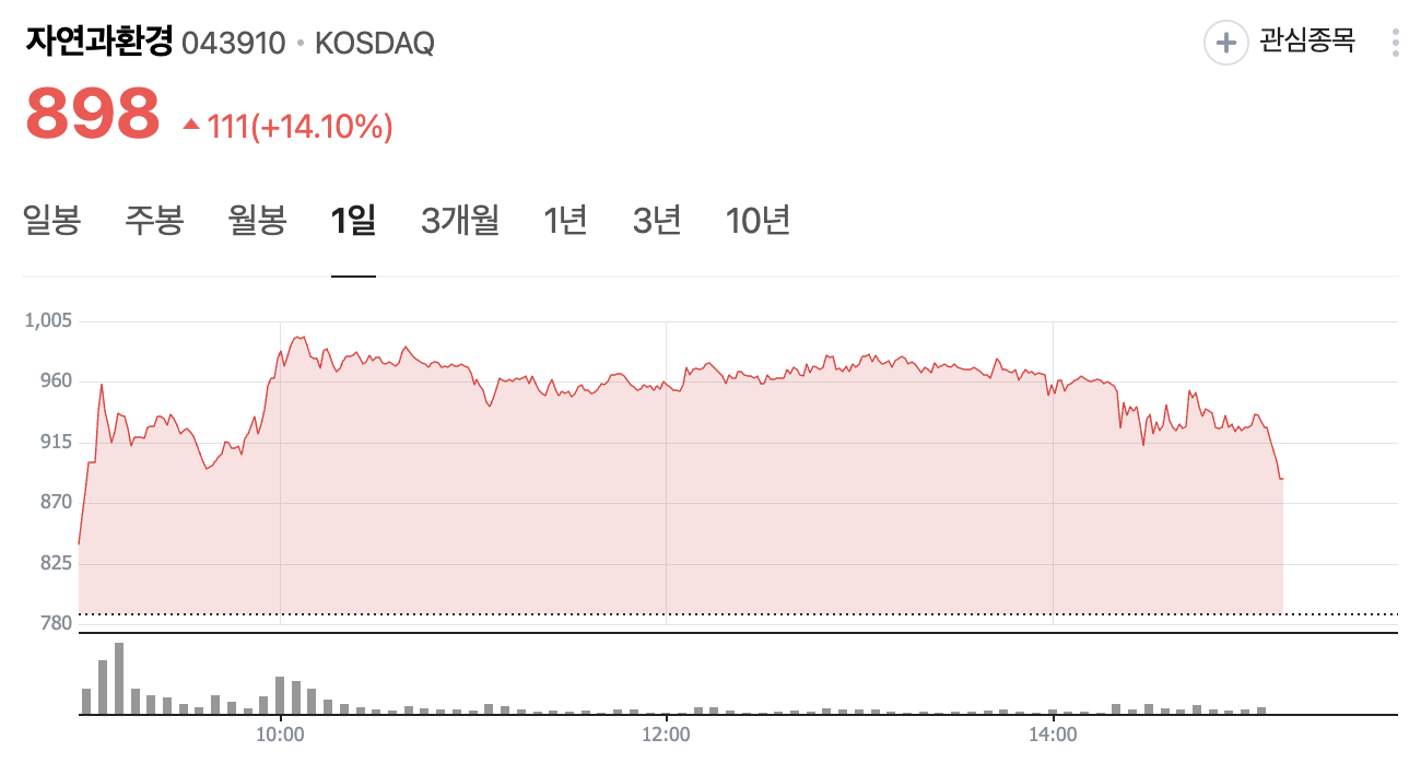 2025년 3월 28일 기준 자연과환경의 주가는 898원으로, 전일 대비 14.1% 상승하였습니다. 급등 원인은 산불 복구 테마와 친환경 정책에 대한 기대감입니다.