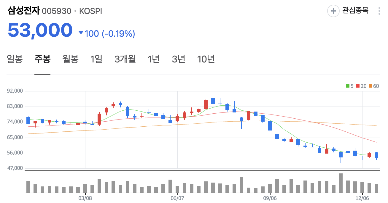 최근 삼성전자 주가가 4만원대로 떨어진 이후 다행히 5만 전자를 회복하며 횡보 추세를 보이고 있습니다.