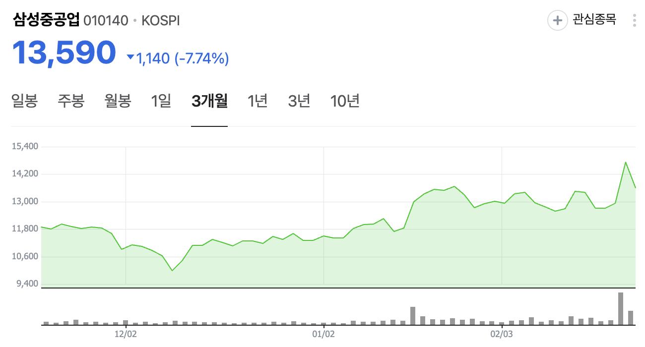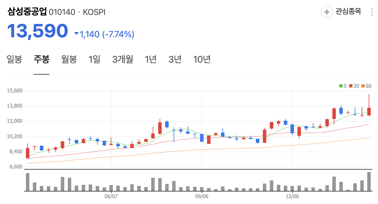 어제 삼성중공업 주가가 13% 급등하며 마감되었습니다.