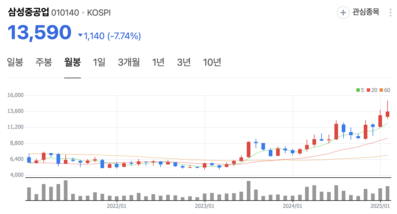 삼성중공업의 일봉 차트를 보면 우상향 상승 추세를 이어가고 있습니다.