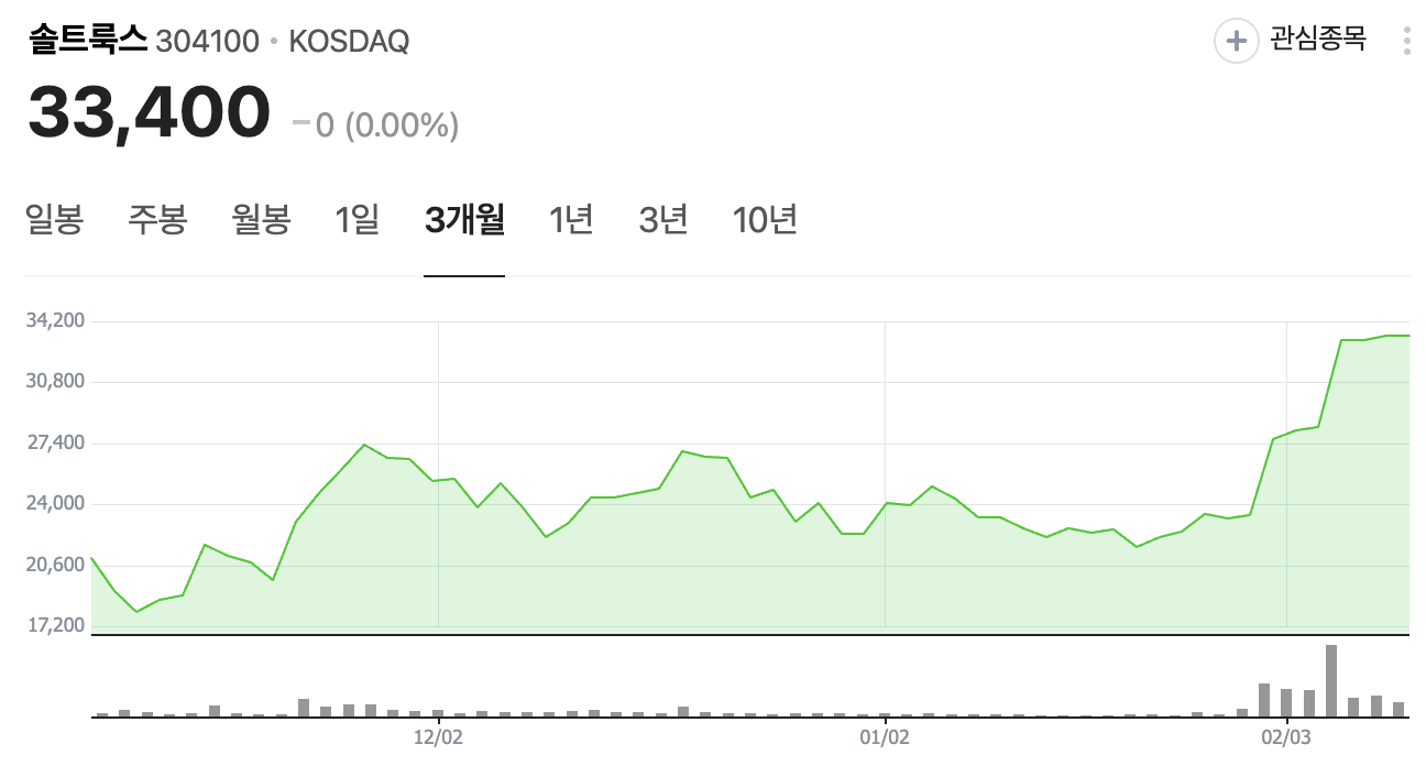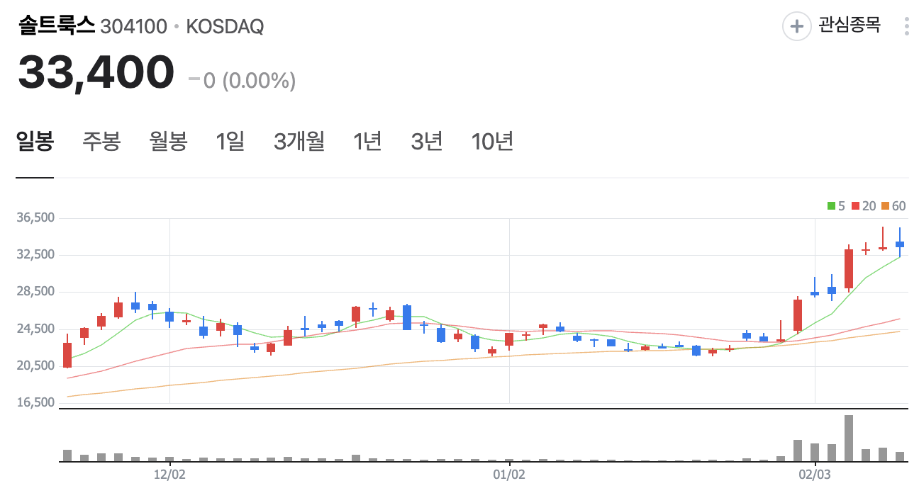 2025년 2월 10일, 솔트룩스의 주가는 33,400원에 거래되었습니다. 최근 며칠간 주가는 뚜렷한 상승세를 나타내고 있는데요.