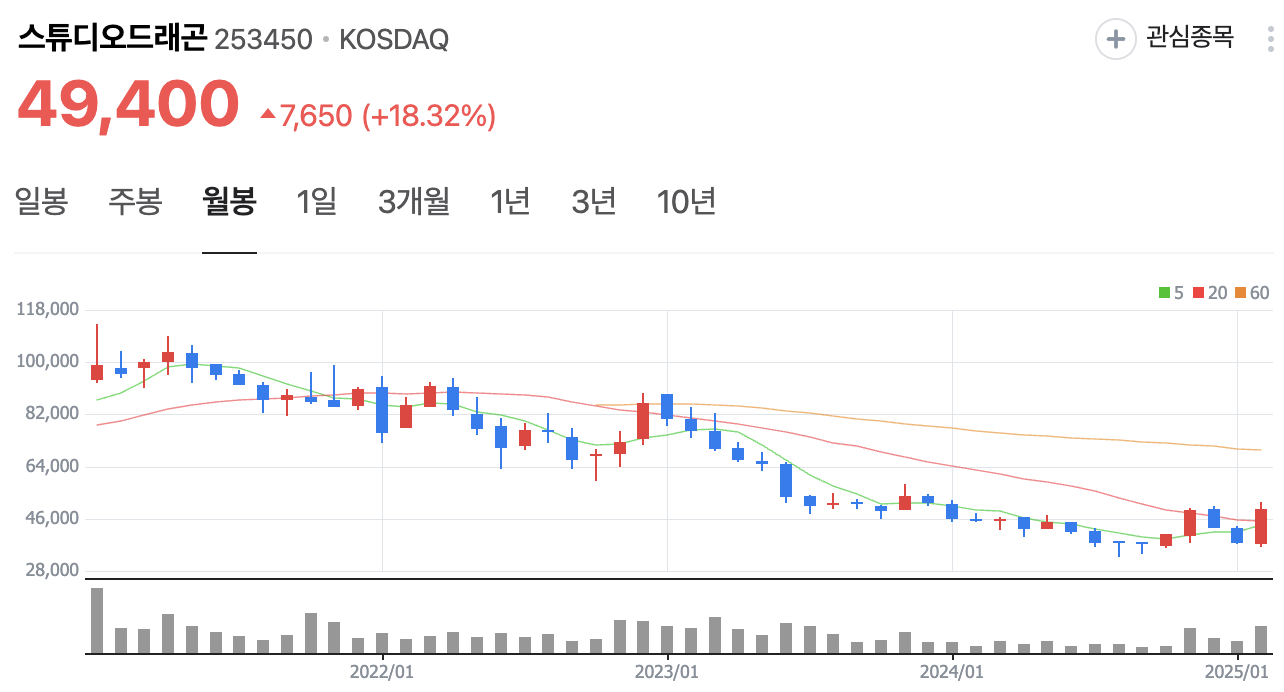 과거 12만 원까지 상승했던 스튜디오드래곤은 장기간 박스권을 형성하다가 최근 상승 전환을 시도하고 있습니다. 2월 들어 거래량 증가와 함께 상승폭이 확대되고 있으며, 향후 추가 상승 가능성이 기대됩니다.