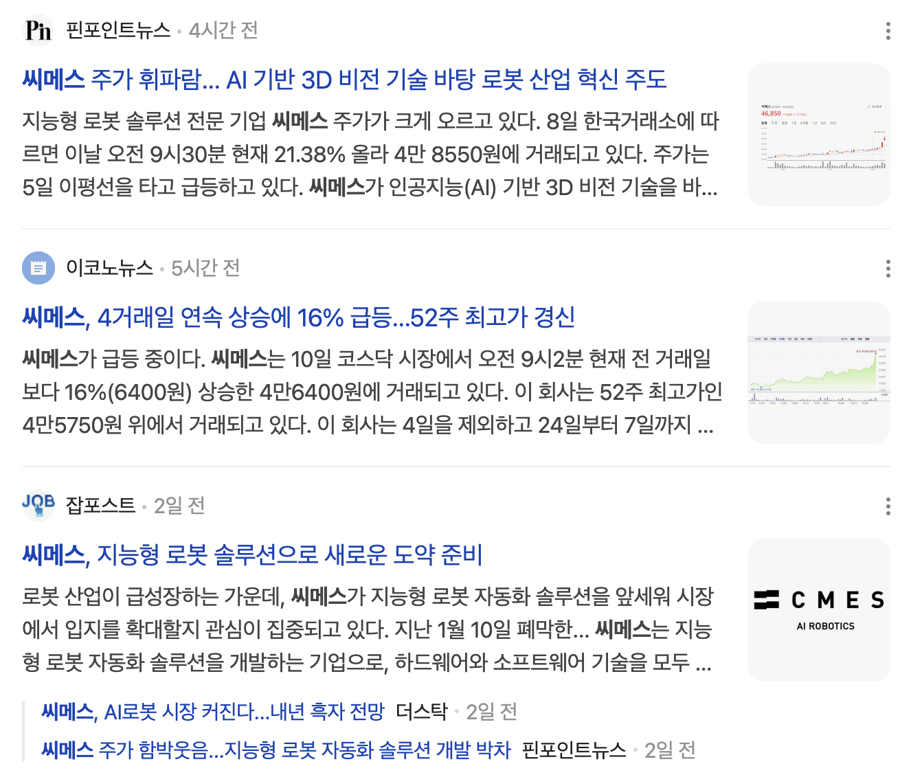 • AI 로봇 시장 성장: 글로벌 로봇 산업이 빠르게 발전하면서 씨메스의 사업 확장 가능성이 커지고 있습니다.