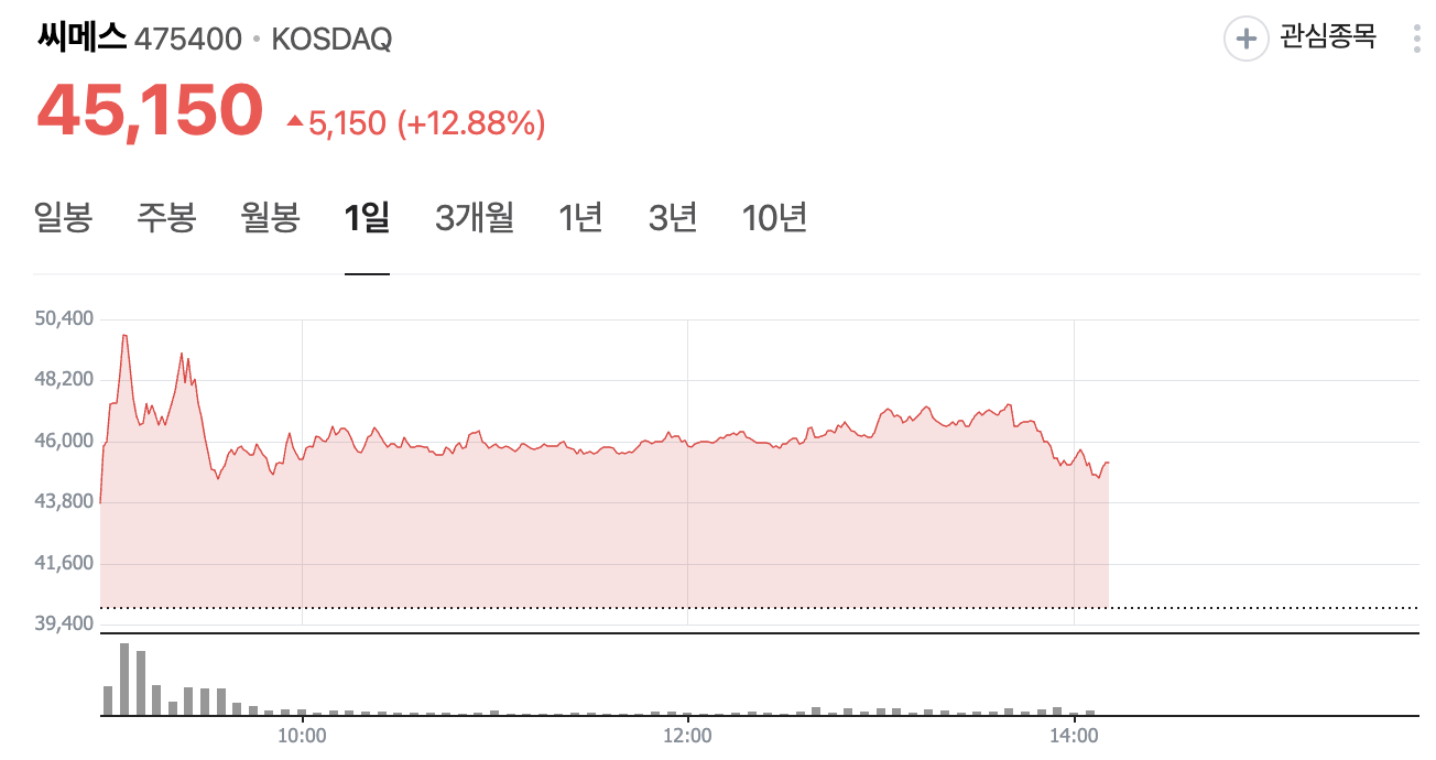 2025년 2월 10일 기준, 씨메스의 주가는 45,150원을 기록하며 전일 대비 18.50% 상승하였습니다. 이는 AI 로봇 산업의 급성장과 더불어 씨메스의 기술력이 시장에서 긍정적으로 평가받고 있기 때문으로 분석됩니다.