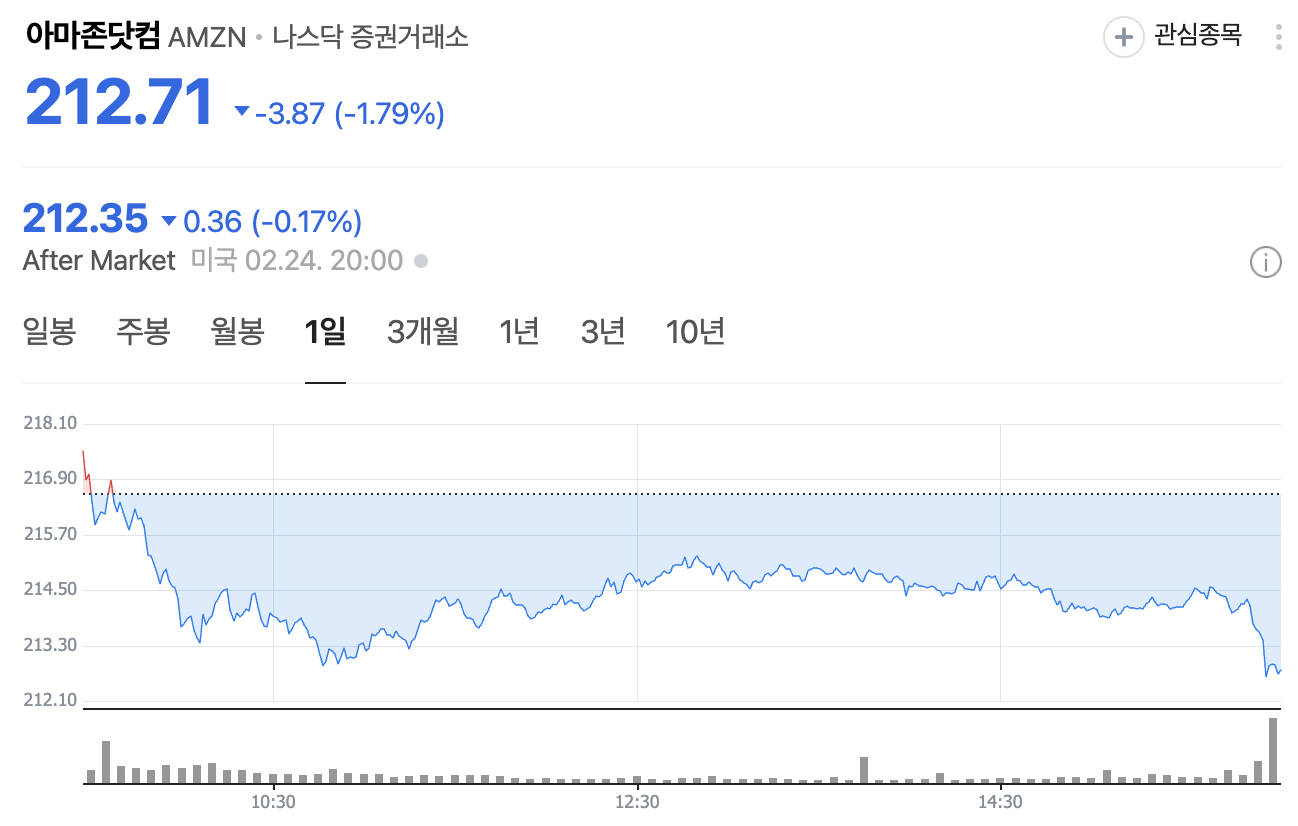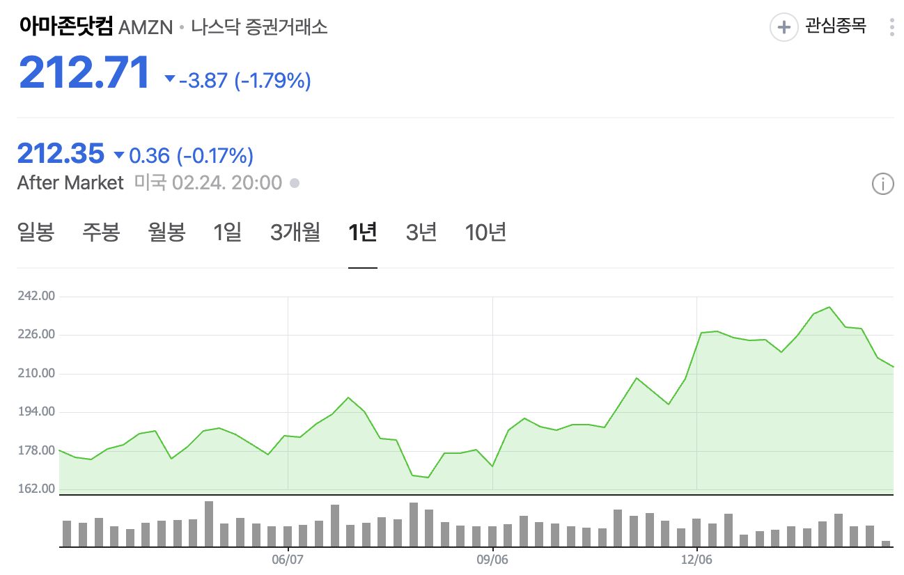 2025년 2월 24일 기준, 아마존(AMZN)의 주가는 약 212.71달러를 기록했습니다. 이날 거래량은 약 4,200만 주, 거래대금은 55억 달러 수준이었죠. 저는 차트를 처음 열어보며 최근 흐름을 살폈는데, 아마존은 AWS(Amazon Web Services)의 성장과 광고 사업 확장 덕분에 연초 대비 36.87% 상승한 상태입니다. 특히 2024년 4분기 매출 1,878억 달러로 월마트(1,805억 달러)를 넘어섰다는 소식이 주가에 힘을 실어줬습니다.