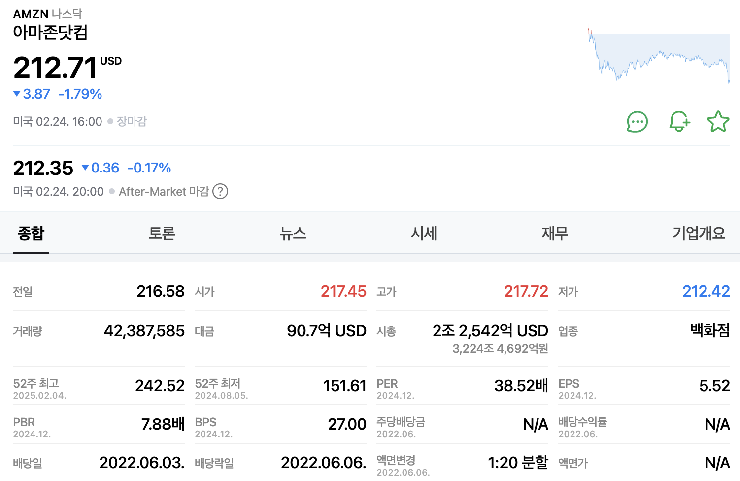 - 2025년 2월 24일: 212.71달러 (현재가)