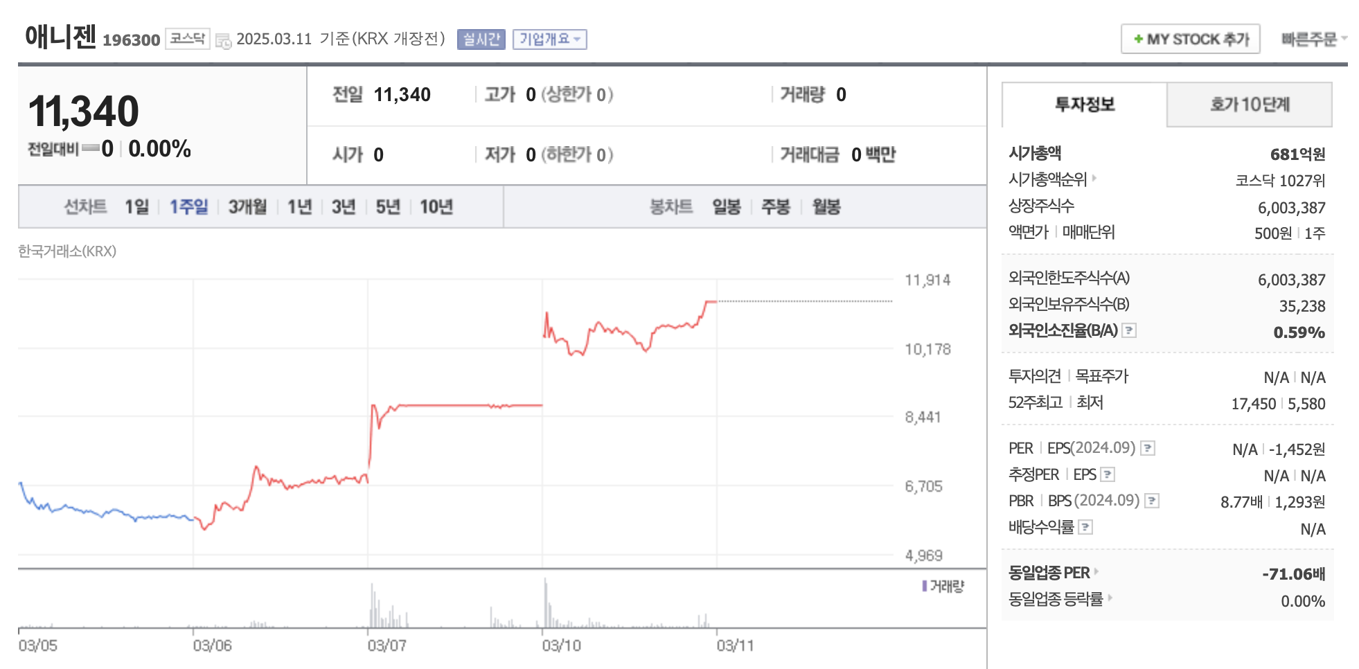 2025년 3월 10일 기준 주가는 11,340원으로, 시간 외 거래에서 상한가를 기록했어요. 단기 변동성이 크며, 급등락이 반복되고 있습니다.