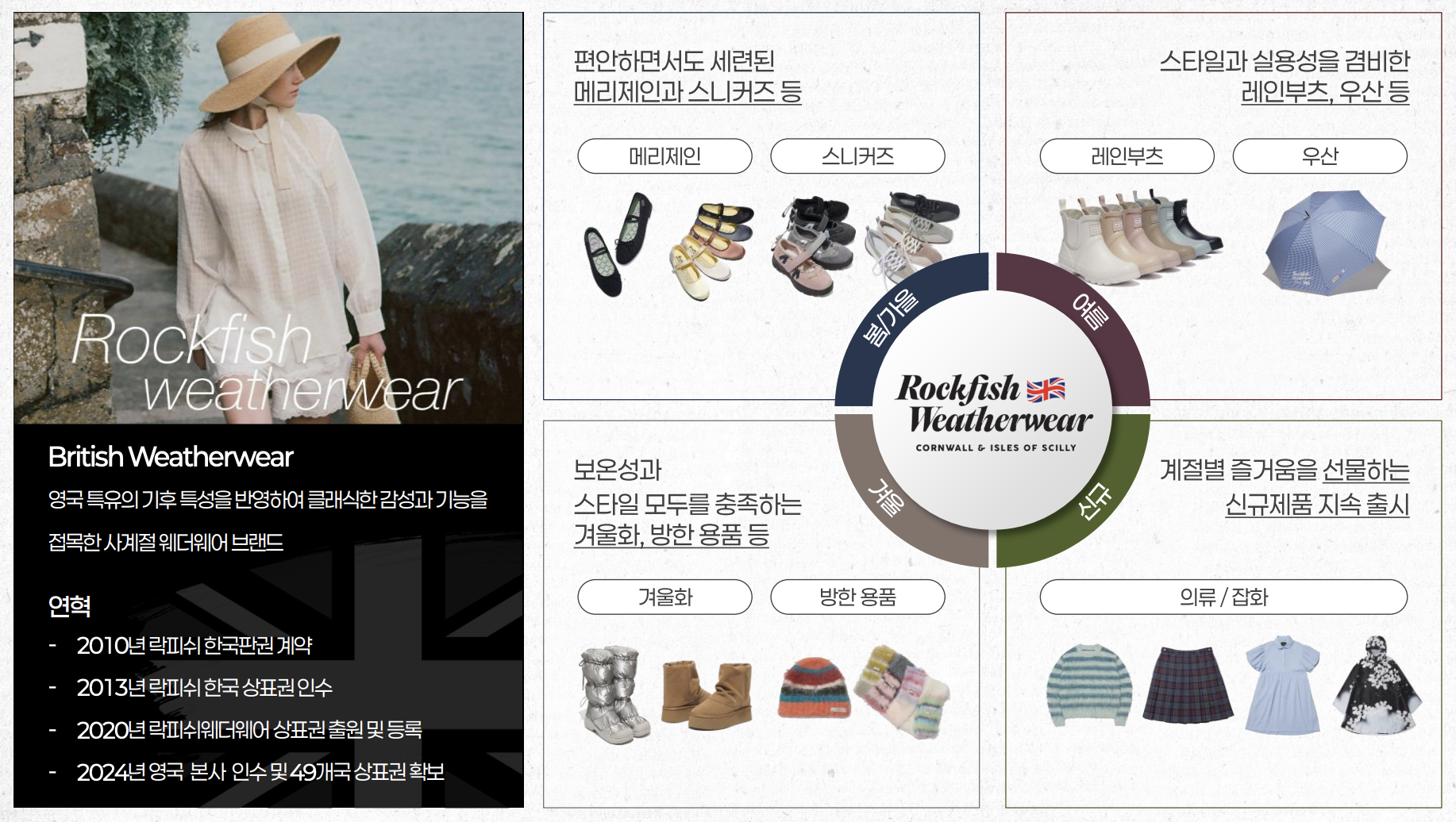 에이유브랜즈는 락피쉬 웨더웨어(Rockfish Weatherwear)라는 사계절 패션 브랜드를 운영하는 기업이에요. 레인부츠부터 메리제인, 겨울 신발, 잡화까지, 특히 2030 여성층을 타깃으로 한 감성적인 아이템들이 인상적이죠. 저도 비 오는 날 락피쉬 레인부츠를 신고 다니며 ‘이 브랜드 정말 괜찮다’고 느꼈던 기억이 나네요. 이 회사는 2022년에 모회사 에이유커머스에서 분할 설립됐고, 2024년엔 영국 락피쉬 브랜드 보유사 젠나(ZENNAR)를 인수하며 글로벌 확장에도 나섰습니다.