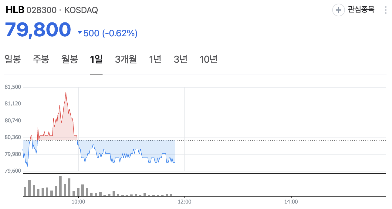 2025년 1월 22일 12:00시 기준 에이치엘비의 주가는 약 79,800원으로, 전일 대비 0.6% 하락하는 모습을 보이고 있습니다. 최근 3개월간 상승률은 약 30%에 달합니다. 52주 최고가는 129,000원, 최저가는 42,000원으로 기록되며, 주가는 단기적으로 하락세를 보였으나 연간 기준으로 상승세를 유지하고 있습니다.