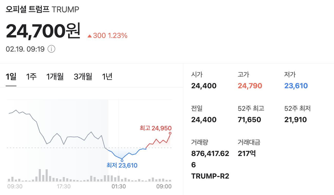 오피셜트럼프 코인은 출시 직후 800% 상승하여 최고 74.71달러까지 치솟았지만, 현재는 16달러선에서 거래되고 있습니다.