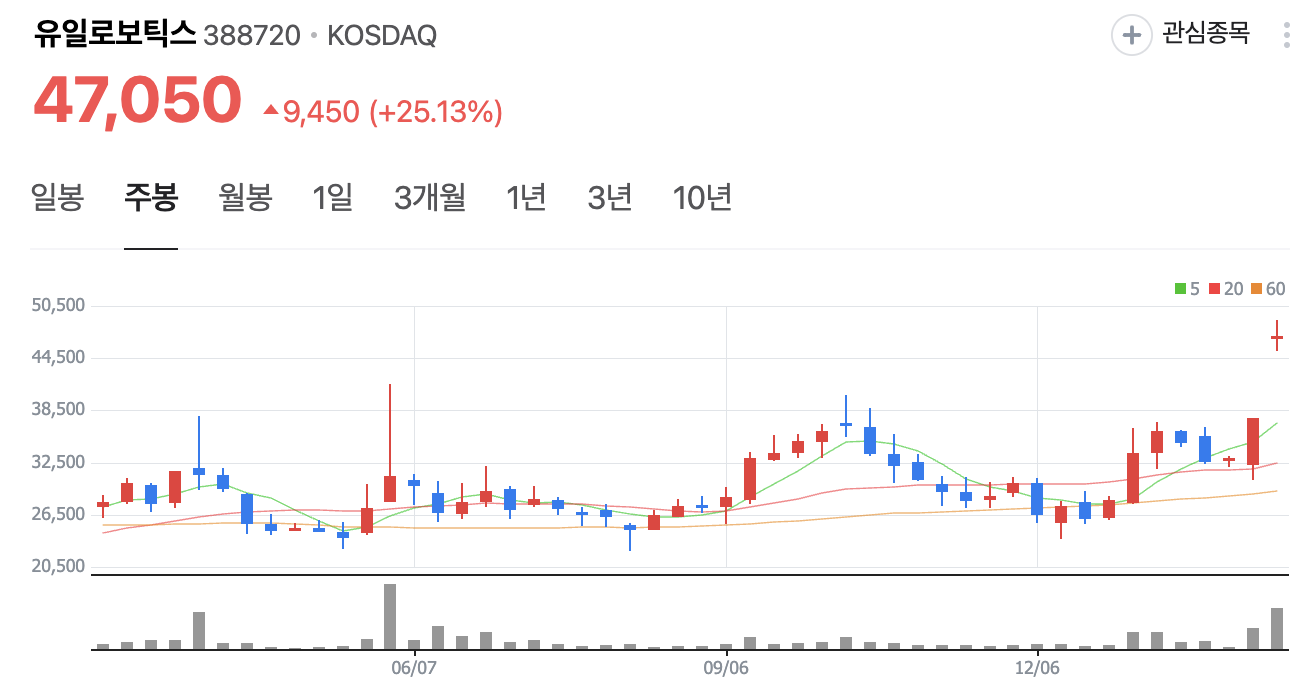 2025년 2월 10일 기준, 유일로보틱스의 주가는 약 47,050원을 기록하며 상승세를 보이고 있습니다. 이는 로봇 산업의 성장과 SK그룹의 로봇 프로젝트 관련 소식이 긍정적으로 작용한 결과로 분석됩니다.