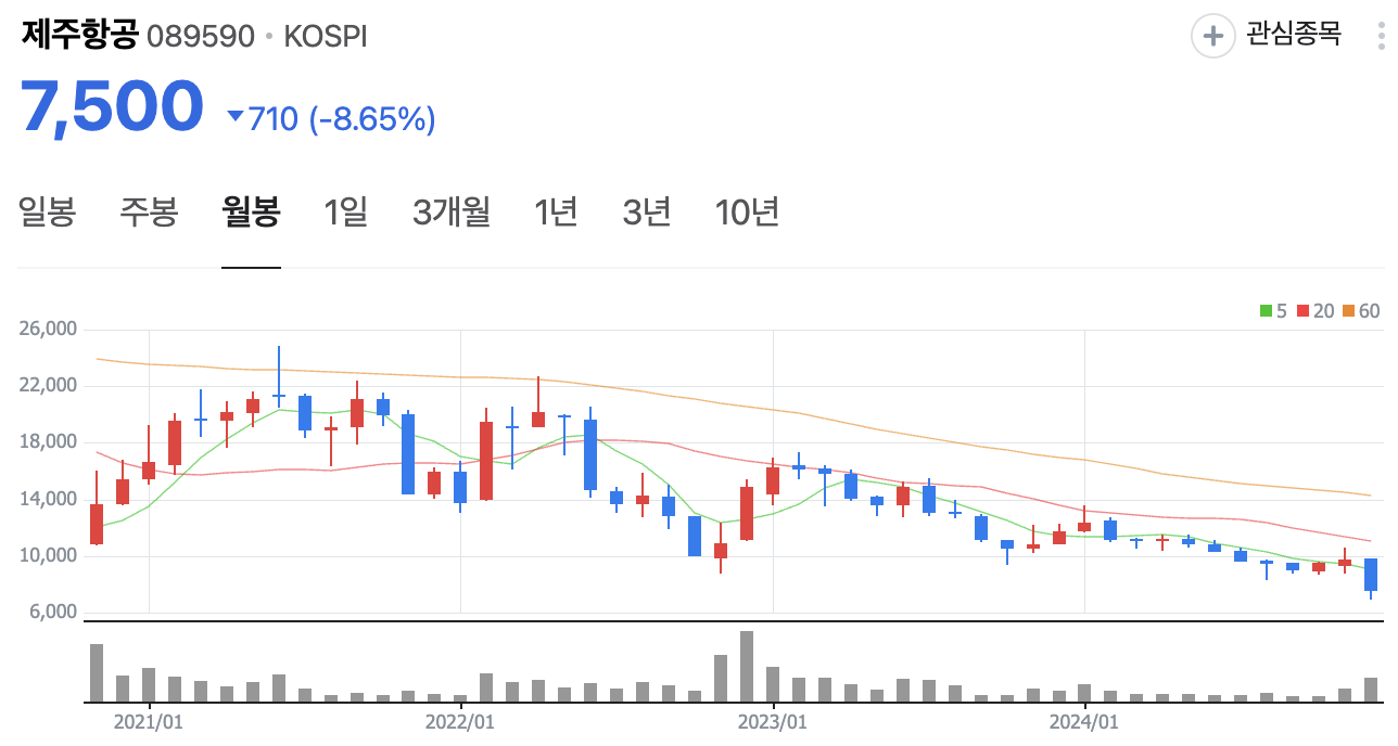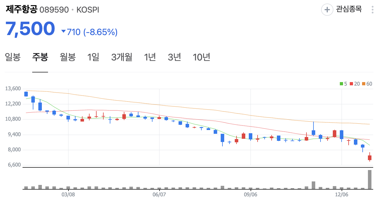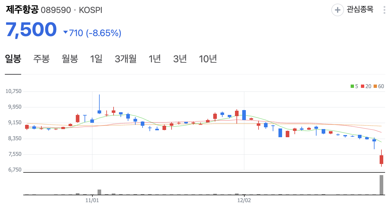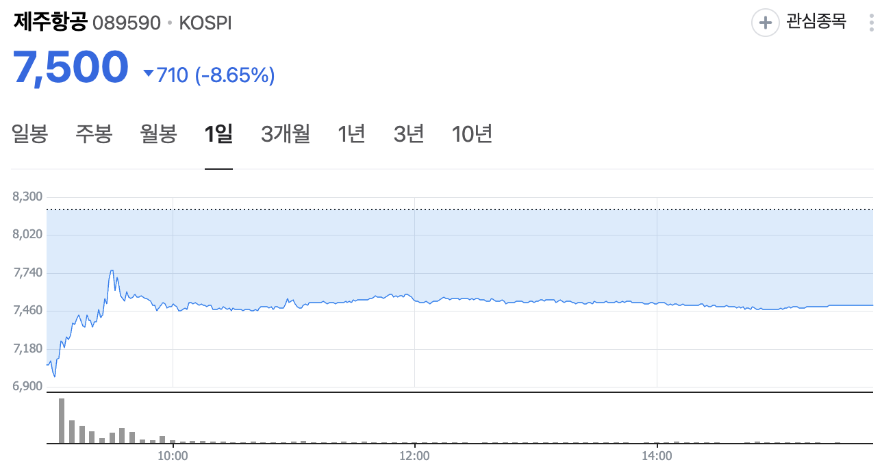 국내 1위 LCC(저비용항공사)인 제주항공은 이번 사건으로 인해 주가가 하루 만에 -8% 하락하며 마감했습니다.