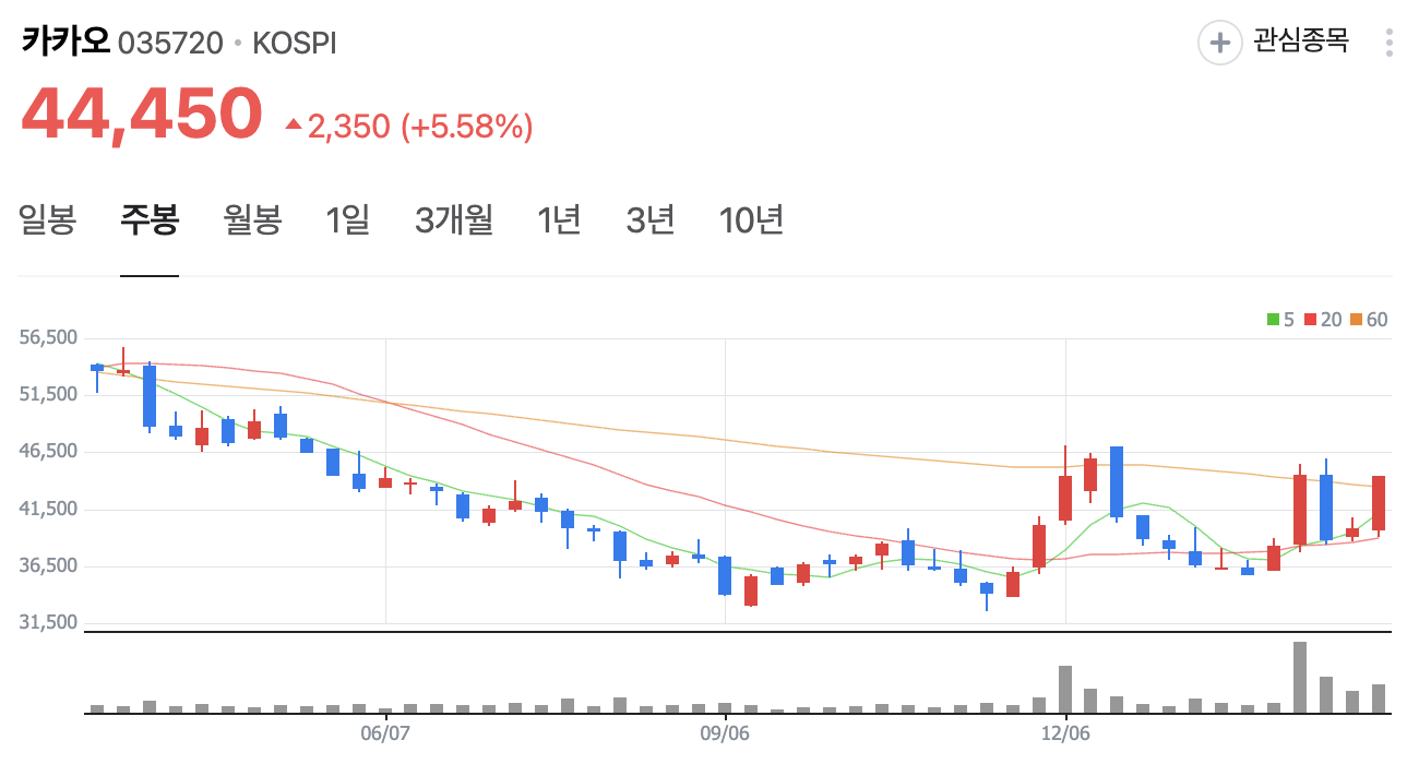 카카오(035720)가 요즘 제법 힘을 내고 있네요. 카카오 투자자의 한 사람으로 시장을 지켜보며 느끼는 게 많지만, 카카오처럼 애증의 주식이 다시 오르기 시작하면 마음이 조금 복잡해집니다. 오늘 또 5% 넘게 올라 마감했다는데, 이 흐름이 어디까지 갈지 궁금해졌습니다. 조직 개편과 오픈 AI 협업 소식이 들리며 분위기가 달라진 것 같아, 차분히 살펴보며 정리해보고 싶습니다.