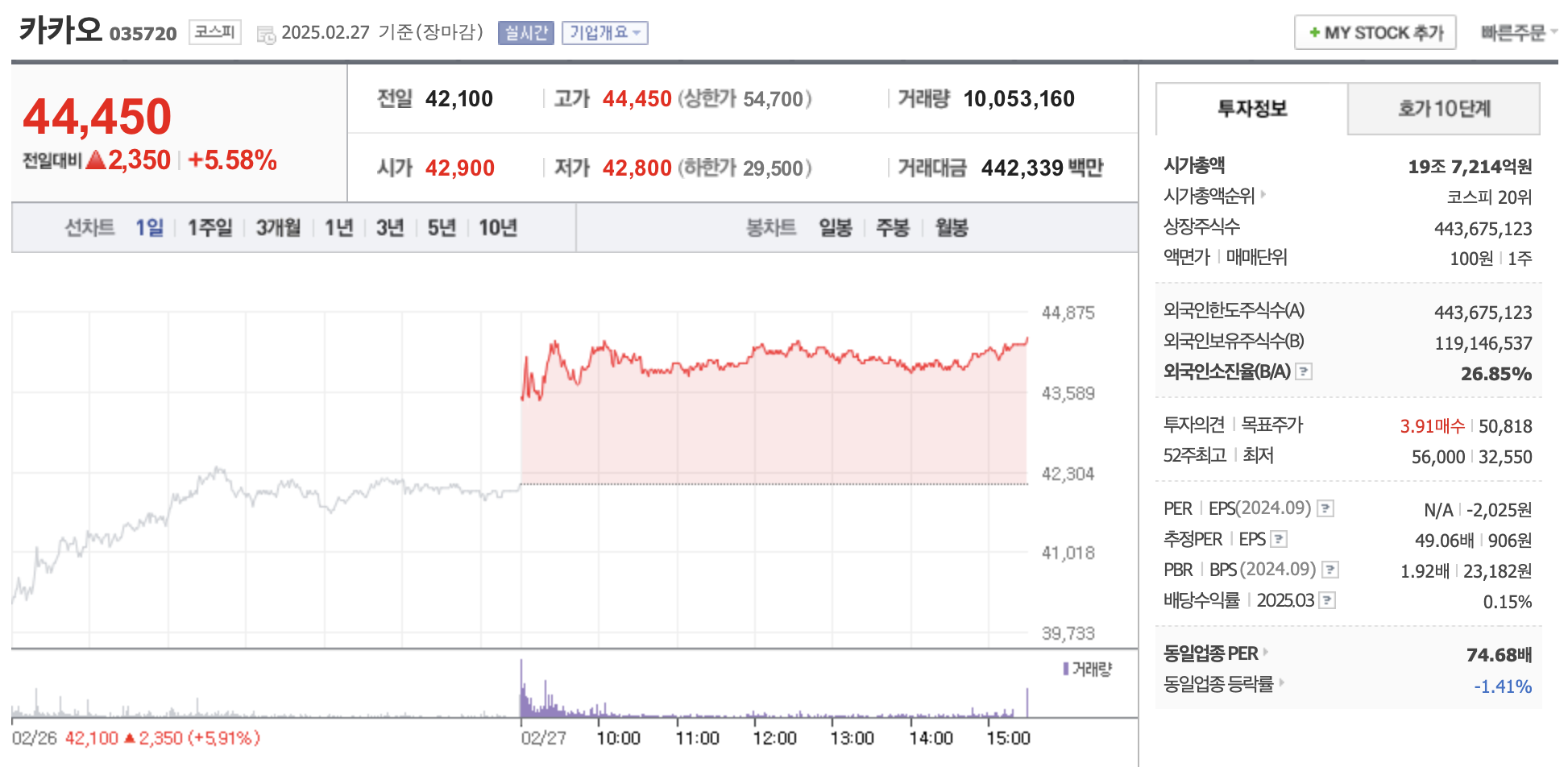 최근 카카오 소식을 들여다보니, 조직 개편과 오픈AI오픈 AI 협업 이야기가 주목받고 있었습니다. 2월 초 카카오는 오픈 AI와 전략적 제휴를 발표하며 AI 에이전트 ‘카나나’에 챗GPT 기술을 접목한다고 밝혔죠. 또, 플랫폼과 콘텐츠 사업을 강화하기 위한 조직 개편도 진행 중입니다. 2024년 매출 7조 8,738억 원(전년 대비 4.2% 증가), 영업이익 4,915억 원(6.6% 증가)을 기록한 실적도 뒷받침됐고요. 이런 변화가 주가에 힘을 실어준 것 같아요.