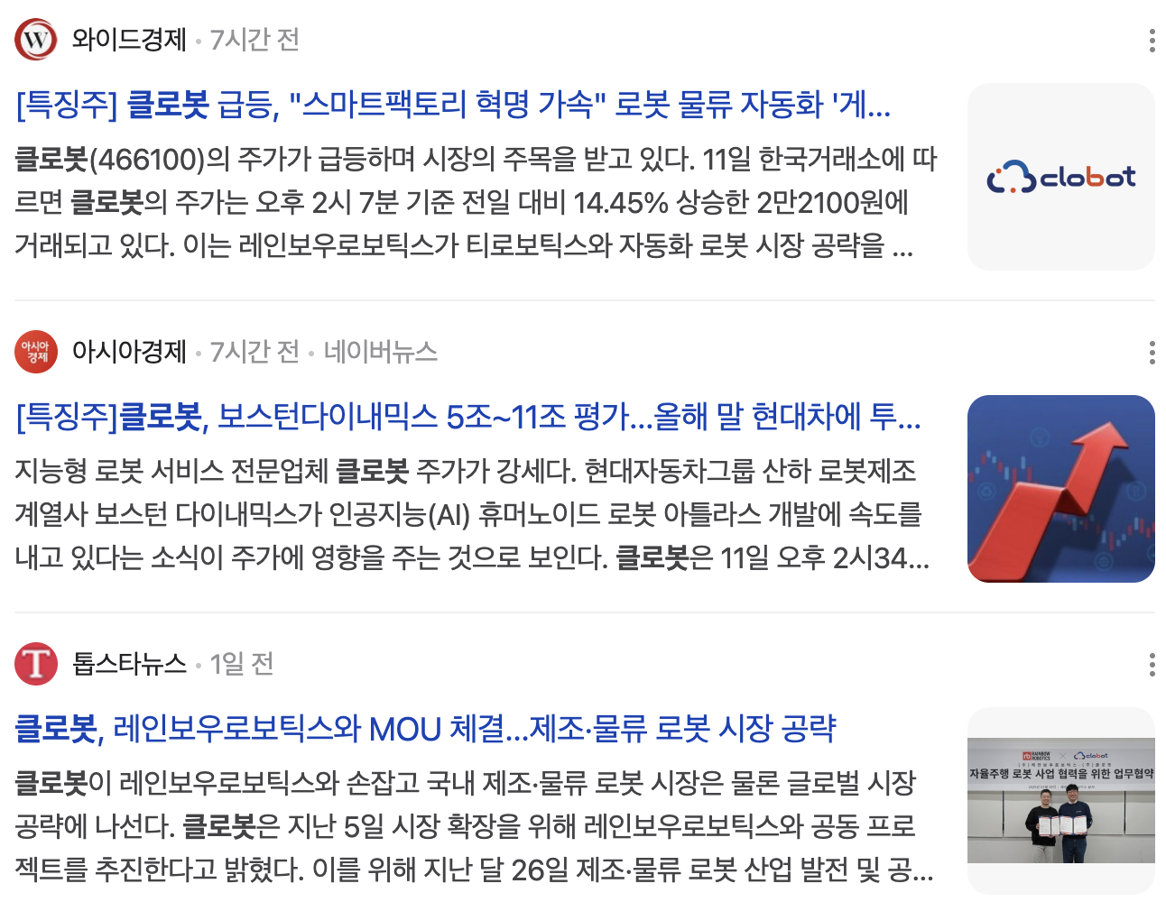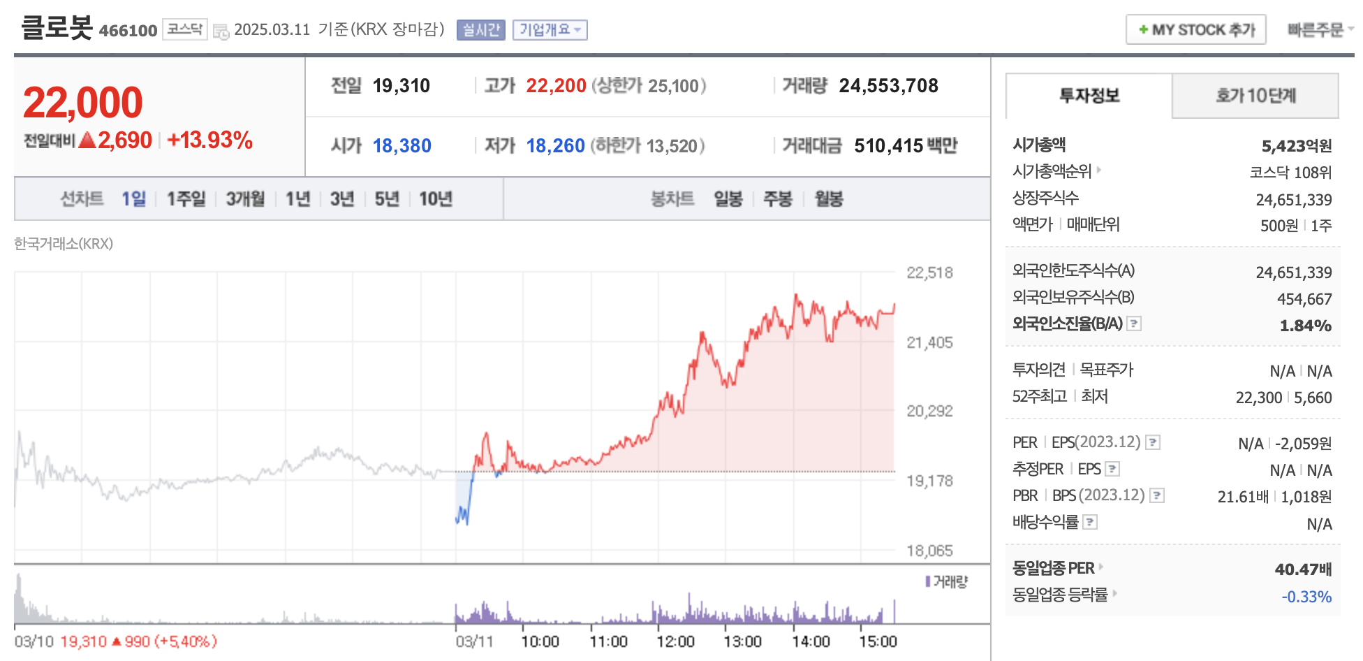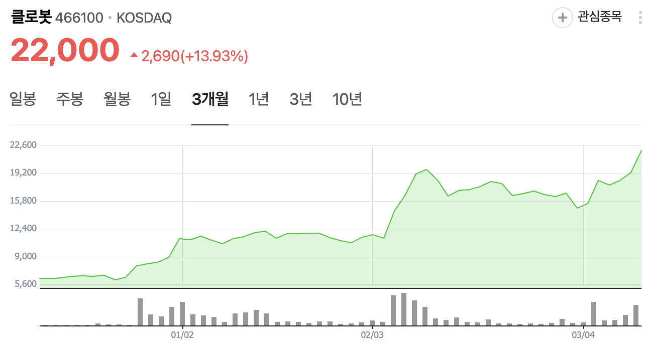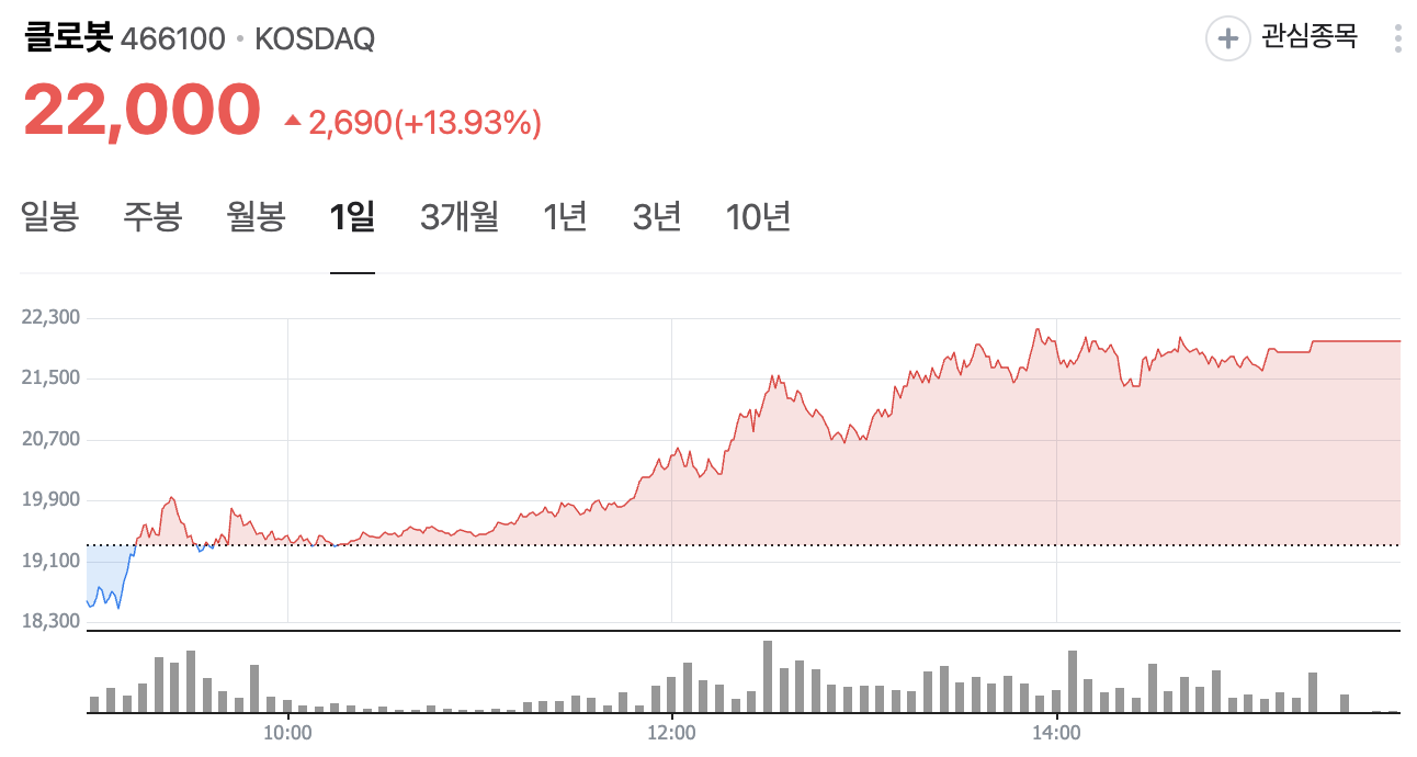 퇴근을 하며 주식 어플을 열었는데, 클로봇(466100)이 13.93%나 뛰며 22,000원에 마감했네요. 최근 가장 주목받는 분야 중 하나인 로봇 관련주를 지켜보며 클로봇의 상승세가 흥미롭습니다. 레인보우로보틱스와의 협력 소식이 화제인데, 차분히 들여다보며 정리해 보겠습니다.