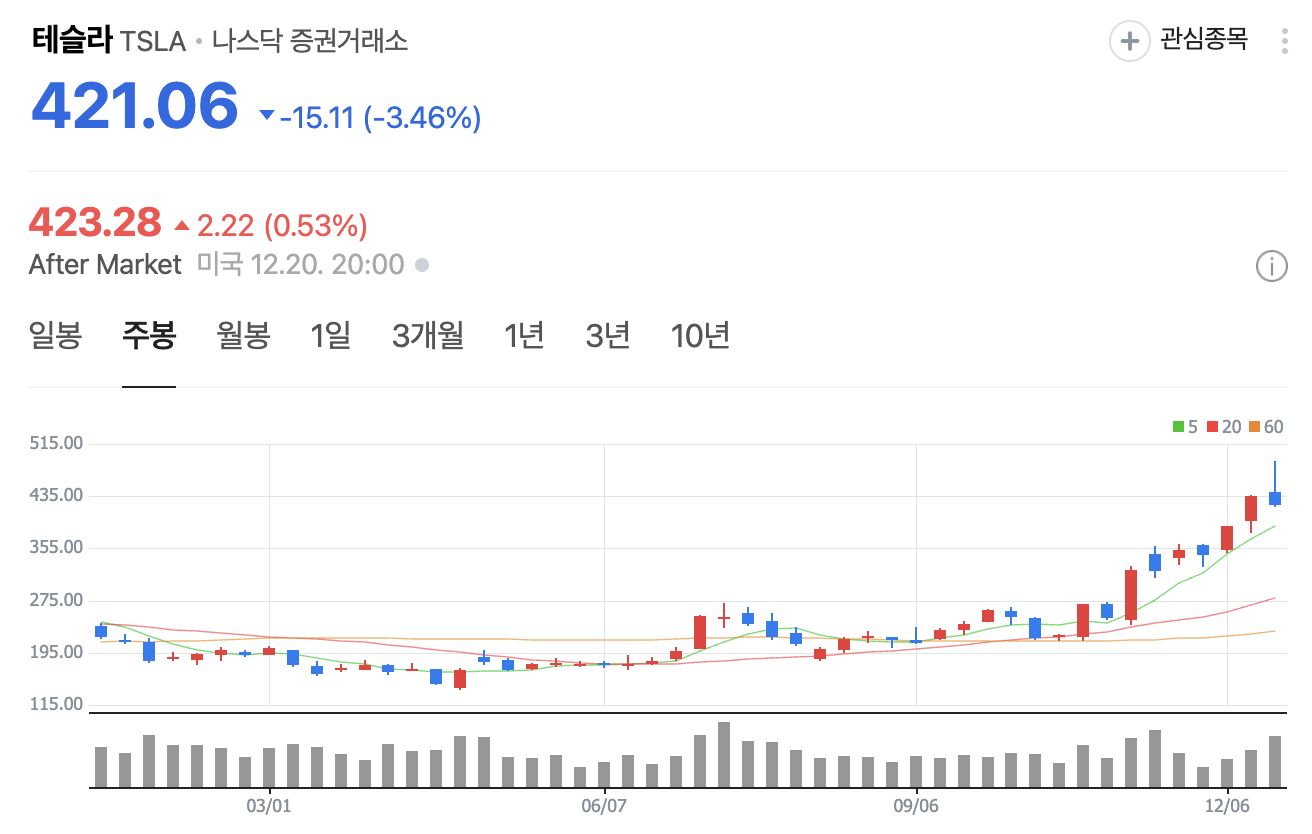 주봉 차트에서는 장기적인 상승세가 더욱 명확하게 드러납니다. 최근 한 주 동안 테슬라는 약 12% 급등하며 강력한 상승세를 보였습니다. 거래량 또한 증가해 투자자들의 관심이 집중되고 있음을 알 수 있습니다.