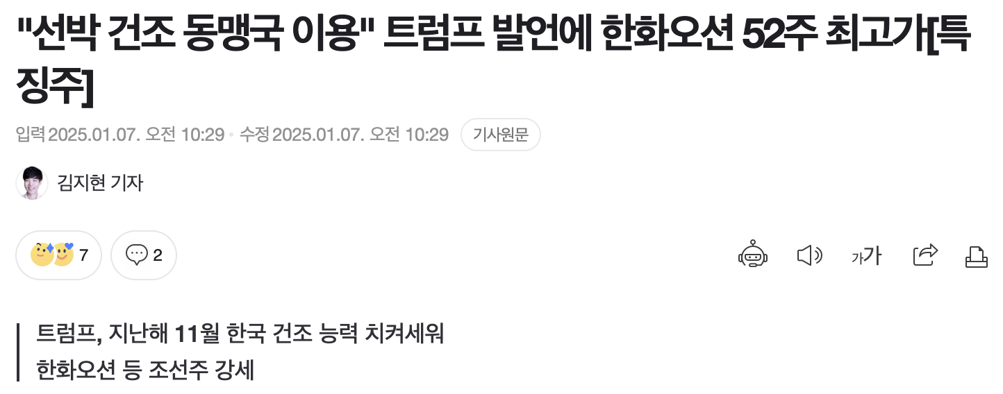 한화오션과 관련된 주요 뉴스를 살펴보면, 두 가지 큰 이슈가 눈에 띕니다. 첫째, 트럼프 전 대통령이 선박 건조와 관련해 동맹국 활용을 언급하며 한국 조선업계에 대한 관심을 높였습니다. 둘째, 한국 수출입은행장이 K조선에 대한 적극적인 금융지원을 약속하며 시장의 기대감을 증폭시켰습니다.