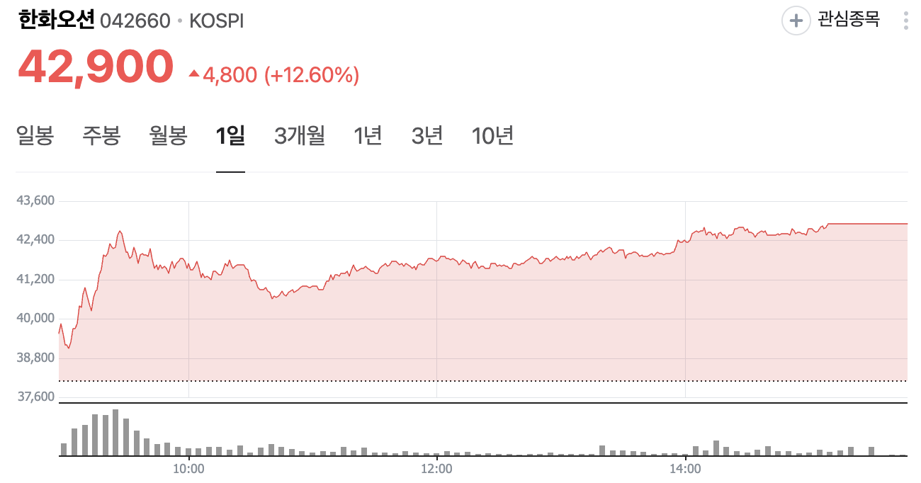 최근에 소개해드린 한화오션의 주가가 오늘 12% 급등하며 마감되었습니다.