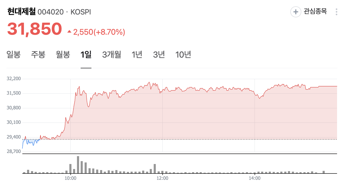 주말을 맞아 커피 한 잔과 함께 주식 앱을 열었는데, 현대제철(004020)이 며칠째 상승세를 이어가고 있네요. 주식 투자자의 한 사람으로 철강주를 지켜보며 현대제철의 움직임이 흥미롭습니다. 지난 3월 7일 주가는 31,850원으로 전일 대비 8.7% 급등했어요. 어떤 이유인지 차분히 들여다보며 정리해 보겠습니다.