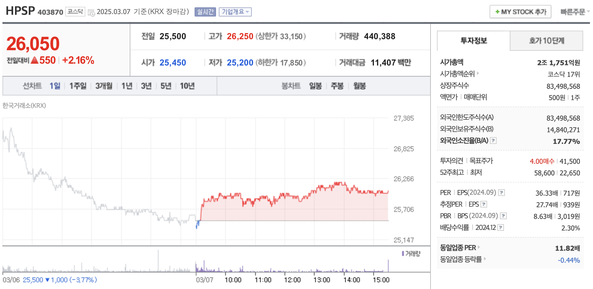 HPSP(357230)가 최근 며칠간 반등하며 눈길을 끌었어요. HPSP의 고압 수소 어닐링 기술이 AI 반도체 시장에서 독보적이라는 점이 늘 흥미로웠습니다. 어제 주가는 26,050원으로 마감했는데, 하락세를 딛고 올라오는 모습이 반갑네요. 차분히 들여다보며 함께 정리해 보겠습니다.