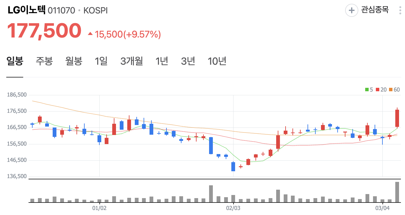 LG이노텍 일봉 차트를 보면, 2월에 139,700원으로 바닥을 찍은 후 반등하여 주가는 60일 이동평균선을 돌파하며 강한 상승세를 보이고 있습니다. 오늘은 거래량이 증가하면서 장대양봉을 형성하며 120일선을 터치했습니다.