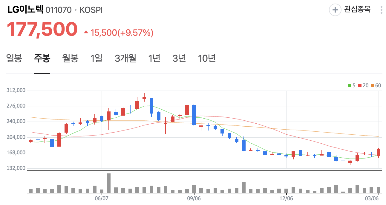 LG이노텍 일봉 차트를 보면, 2월에 139,700원으로 바닥을 찍은 후 반등하여 주가는 60일 이동평균선을 돌파하며 강한 상승세를 보이고 있습니다. 오늘은 거래량이 증가하면서 장대양봉을 형성하며 120일선을 터치했습니다.