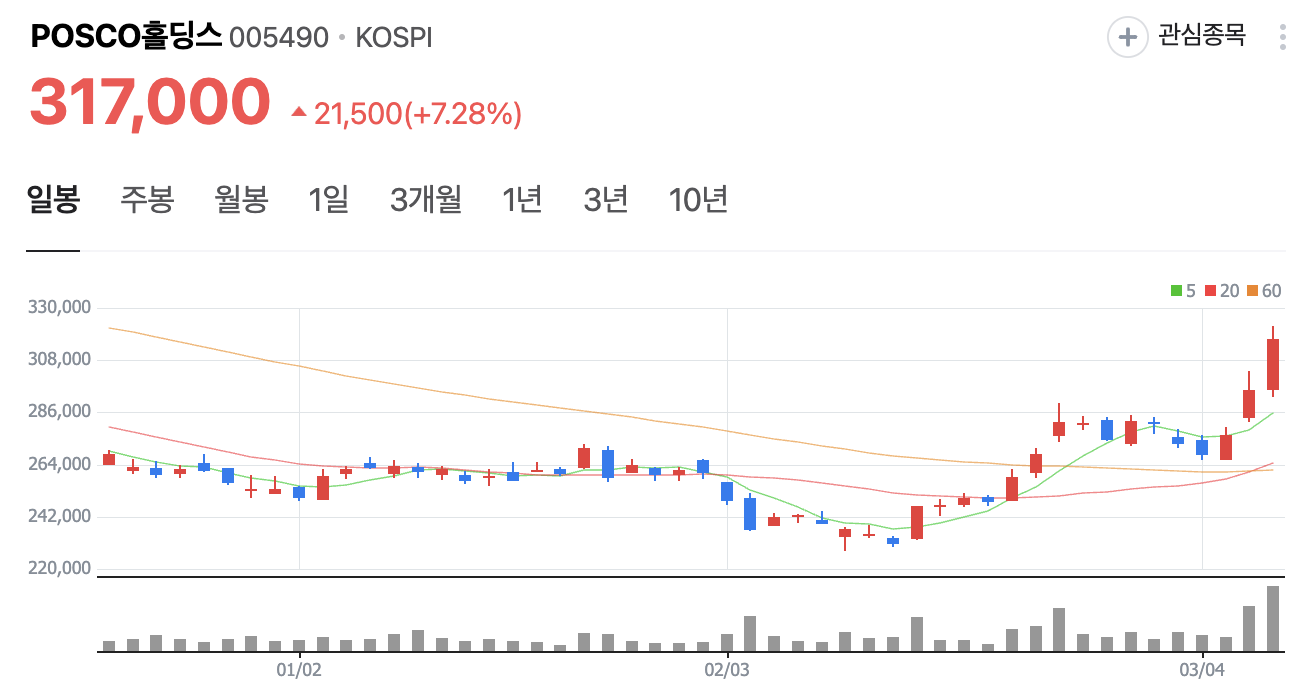 어제저녁, 주말을 앞두고 주식 앱을 열어보니 POSCO홀딩스(005490)가 7%나 급등하며 317,000원으로 마감했네요. 주식경제 전문 블로거로 시장을 지켜보며 POSCO홀딩스는 늘 안정적인 느낌을 줬는데, 이번 급등은 고망간강 소식 때문인 것 같아 흥미롭습니다. 차분히 살펴보며 함께 공부해보고 싶습니다.