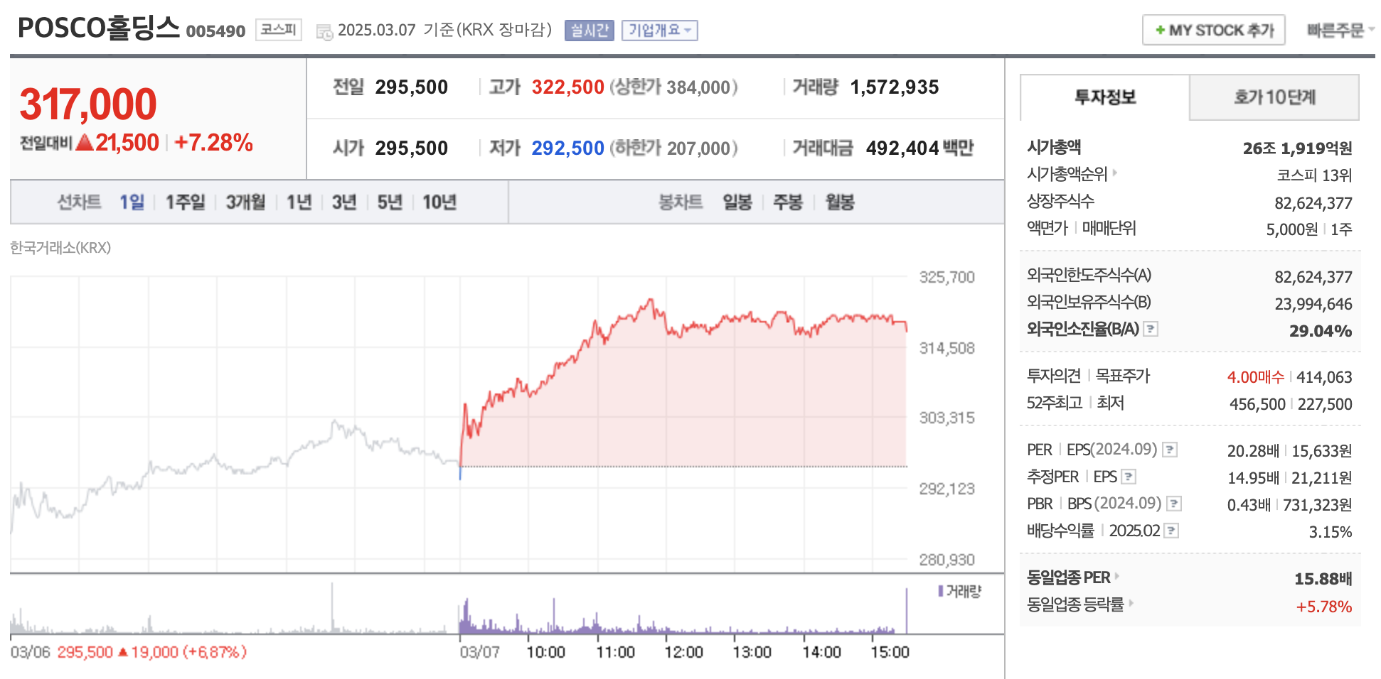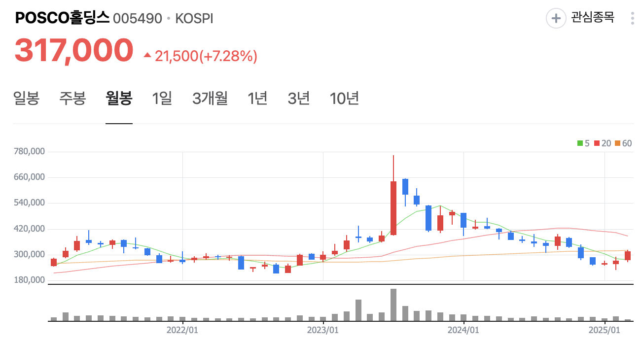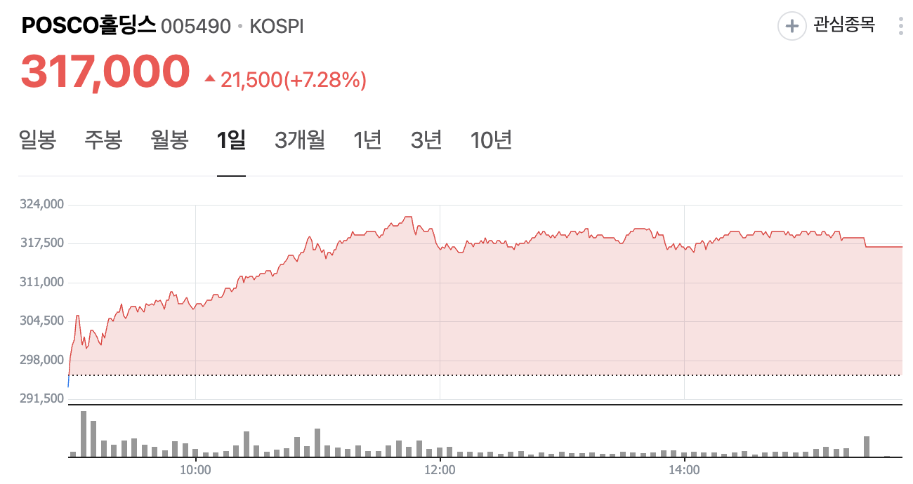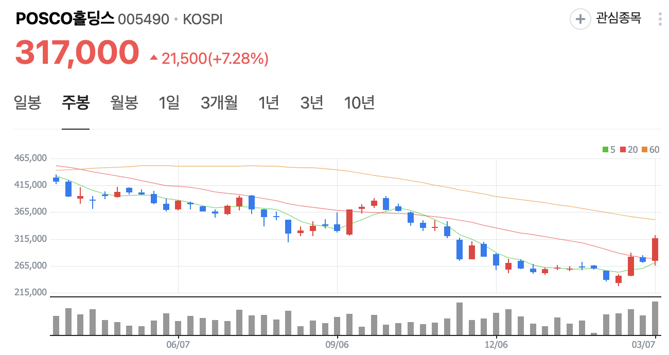 어제저녁, 주말을 앞두고 주식 앱을 열어보니 POSCO홀딩스(005490)가 7%나 급등하며 317,000원으로 마감했네요. 주식경제 전문 블로거로 시장을 지켜보며 POSCO홀딩스는 늘 안정적인 느낌을 줬는데, 이번 급등은 고망간강 소식 때문인 것 같아 흥미롭습니다. 차분히 살펴보며 함께 공부해보고 싶습니다.