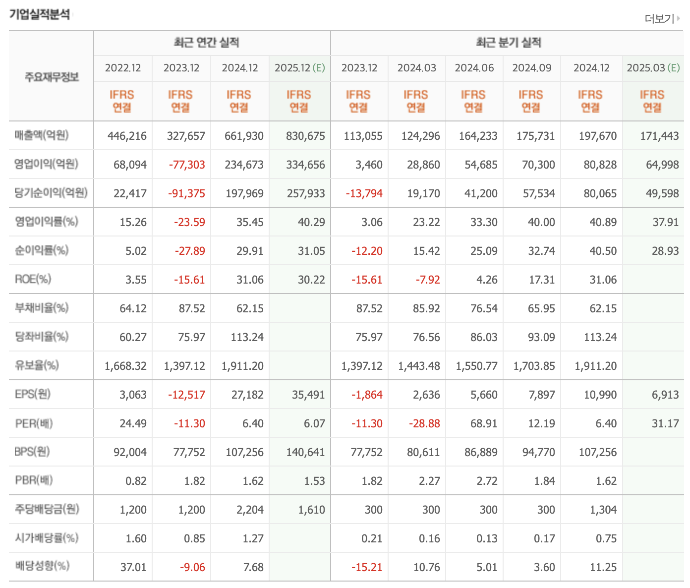 2024년 매출액 66조 원, 영업이익 23조 원으로 흑자 전환했으며, 2025년은 매출 83조 원, 영업이익 33조 원으로 성장세가 예상됩니다.