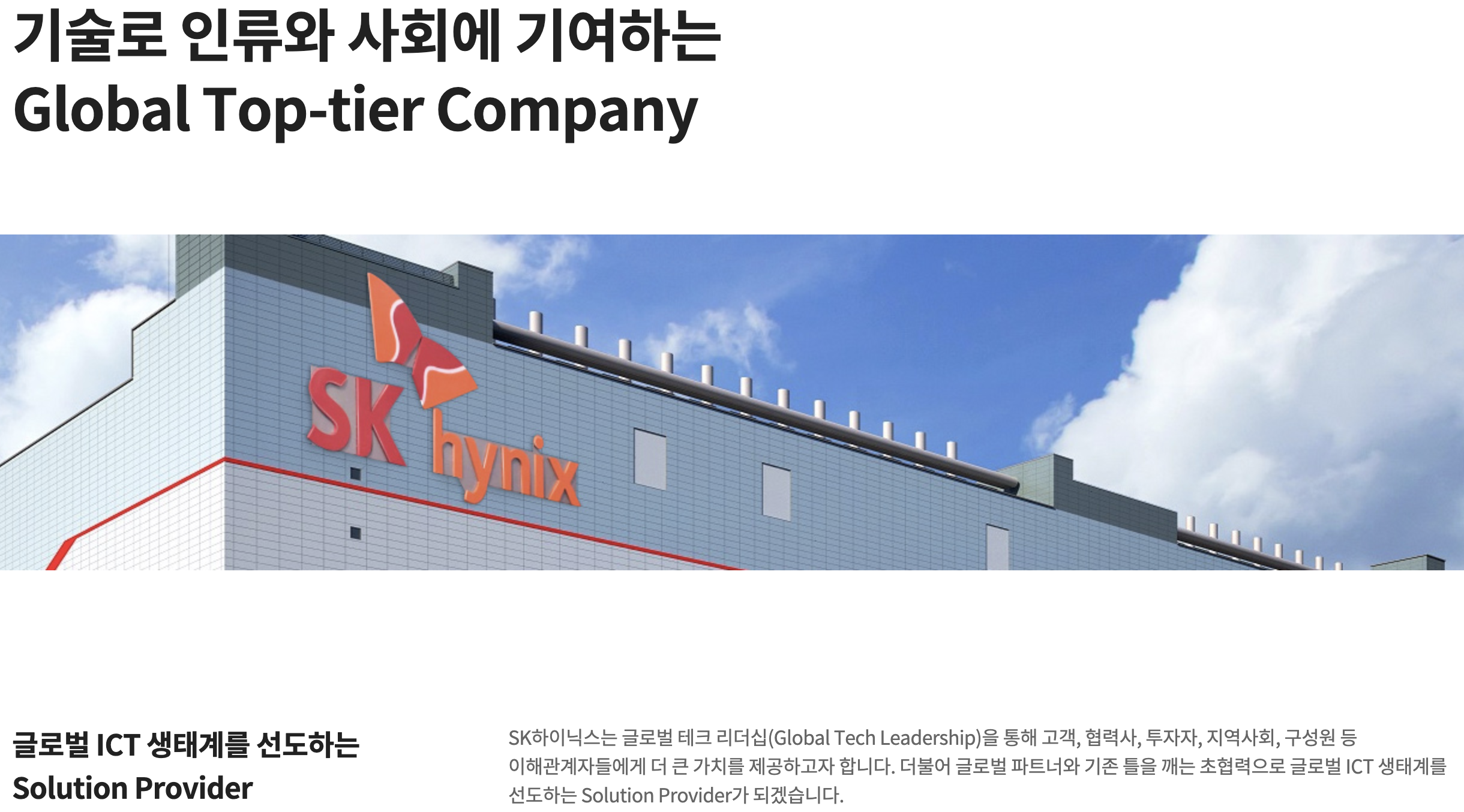 SK하이닉스는 1983년 설립된 국내 대표 반도체 기업으로, DRAM과 NAND 플래시 메모리를 주력으로 생산해요. 글로벌 2위 메모리 반도체 업체로, 이천·청주를 비롯한 국내외 법인을 통해 시장을 선도하고 있습니다.
