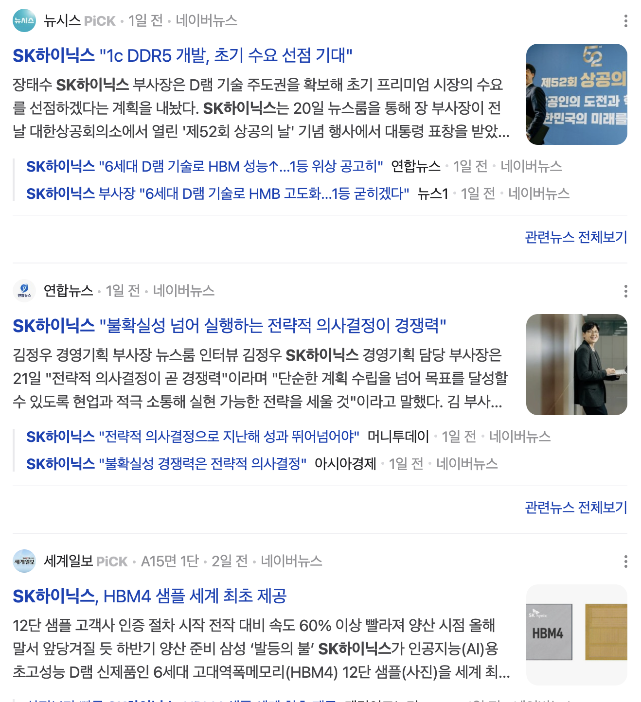 어제(3월 20일) “SK하이닉스, 엔비디아 HBM5 공급 확대” 기사가 나왔어요. GTC 2025에서 AI 메모리 기술을 공개하며 기술 리더십을 강조했고, X 포스트에서도 긍정적인 반응이 많았습니다. 중국 딥시크 경쟁은 우려지만, 장기 수요 증가로 이어질 가능성도 보입니다.