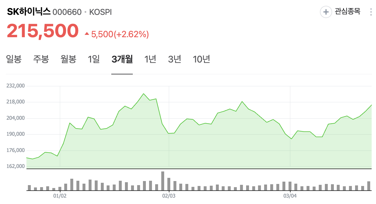 2025년 3월 22일 토요일 아침, 주말을 맞이하며 주식 앱을 열었는데, SK하이닉스(000660)가 215,500원으로 2.62% 상승했네요. 2년 차 주식 블로거로 반도체 시장을 지켜보며, 이번 상승이 흥미롭습니다. HBM 관련 소식이 화제인데, 차분히 정리해 보겠습니다.